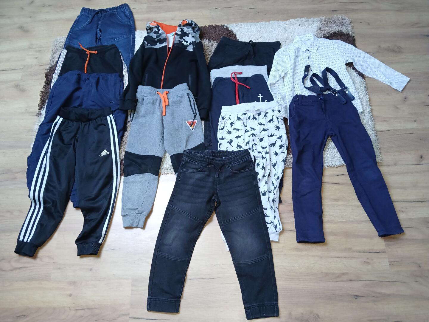 Sprzedam 10 par dziecięcych chłopięcych spodni - rozmiar 122, do spodnie dresowych jest w komplecie bluza z uszkodzonym zamkiem, a do eleganckich granatowych w komplecie koszula i szelki. Stan bardzo dobry i dobry.