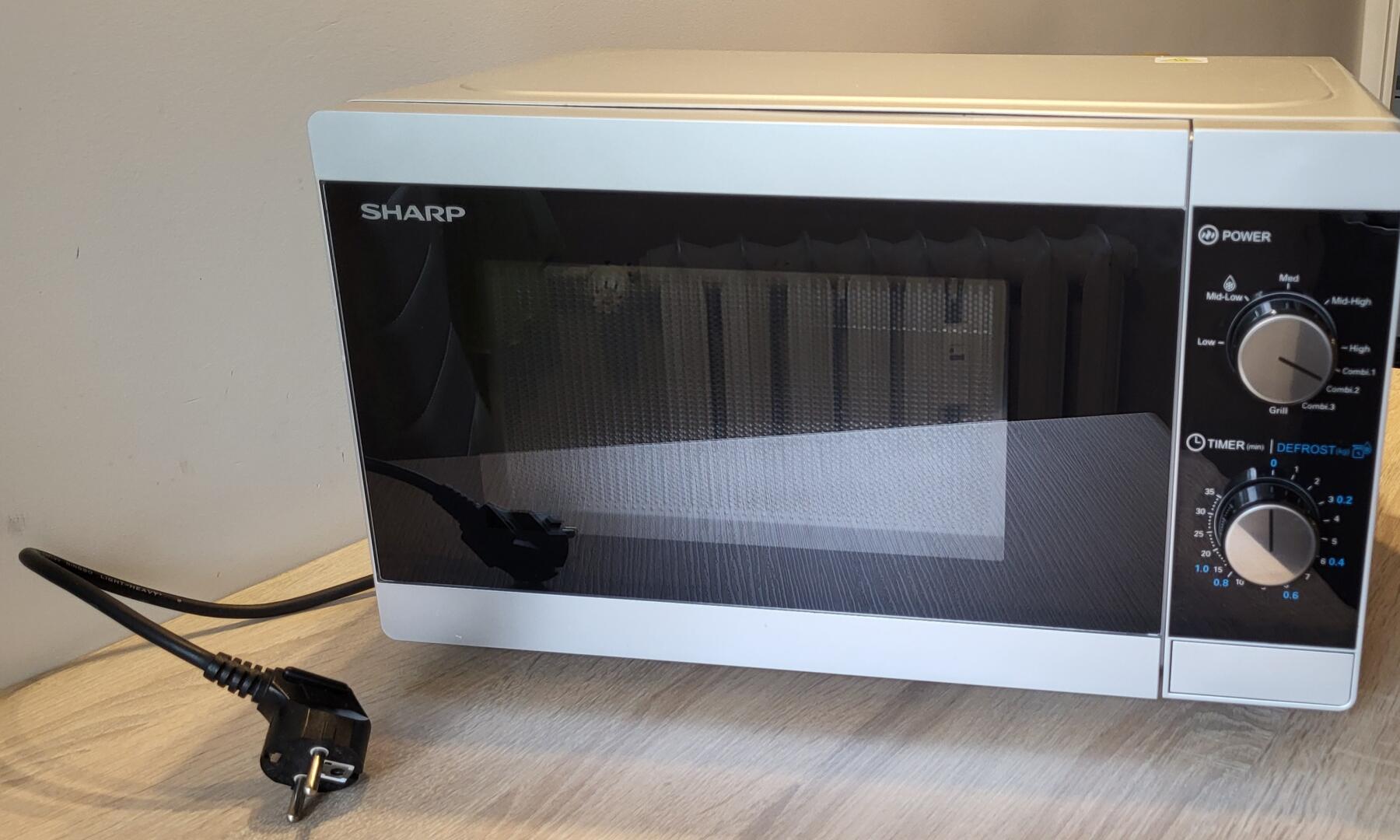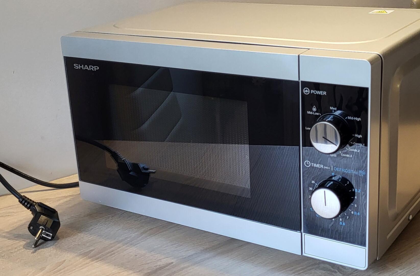 Kuchenka mikrofalowa Sharp YC-MG01E-S z funkcją grilla i sterowaniem mechanicznym. Posiada pojemność 20 litrów